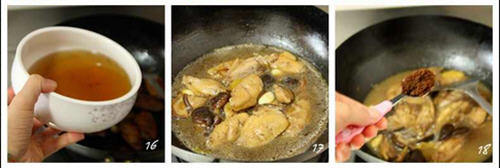 16~17、加入沉淀后的香菇水,水量不用没过食材,大概到食材的2/3位置就行。如果香菇水不够,可以用热水补足。