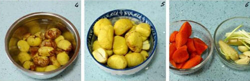 4~5、栗子放在滚水中,浸泡片刻后,去除外衣,备用。