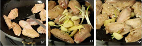11~12、放入葱姜蒜,转中火,继续不停翻炒,直至鸡翅表面呈现焦黄色。