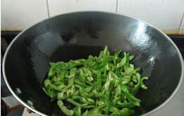 4.炒锅中油烧热后把姜丝倒进去炒香后捞出,再用大火爆炒辣椒;