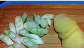 3.葱切成小段,生姜切薄片备用;