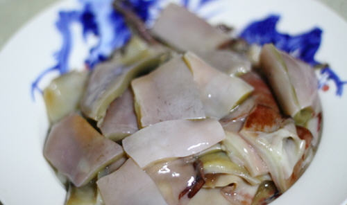1、鱿鱼清洗干净,去掉内脏和表面一层黑皮,并随意切块。
