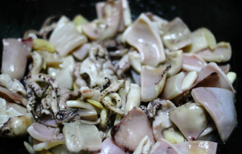 3、煤气灶开火,锅烧热后,倒入少许油,加入蒜炒出香味后,倒入切好的鱿鱼大火翻炒。