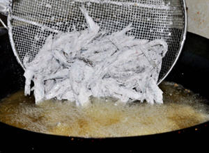 3、中火慢慢油炸十分钟左右小鱼收干水份后捞出沥油。(切忌高油温)