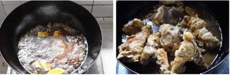 5.放入焯水后的脊骨,加入一勺老抽,翻炒至均匀上色。加入清水烧开,撇净浮沫。