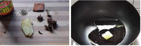 4.锅里在依次加入姜,花椒,八角,桂皮,小茴香,丁香,黄豆酱