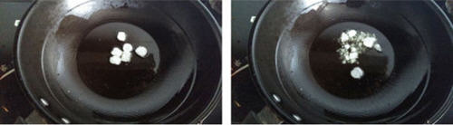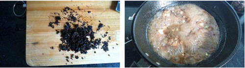 3、 锅里再放入冰糖,不断用铲子来回翻炒,炒至糖浆变深红色。