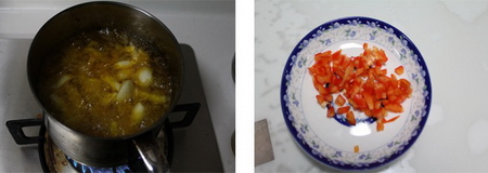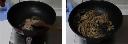 6:放入炸好的白玉菇炒均匀,撒上红椒碎点缀。