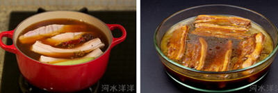 7、这时候你可以尝一下肉,感觉应该有些淡,原因就是因为我们刻意减少盐的用量确保瘦肉部分松软多汁。现在腊汁肉的加热环节已经基本结束,可以做进一步调味了。首先把肉小心地用锅铲或者其它工具转移到一个玻璃或者陶瓷(不要使用不锈钢或者铝合金容器,它们不能长期储存含盐分较多的食物)带盖容器里面,把汤汁中的香料滤去,再倒入这个容器里面,以刚刚能够将肉覆盖为限,如果这个时候汤汁还有剩余,就倒入一个平底锅内,大火收汁后再倒入容器内。这时候尝一下汤汁的味道,按照个人口味,如果还感觉比较淡,就再放一些盐。盖上盖子,冷却到室温后放进冰箱过夜。