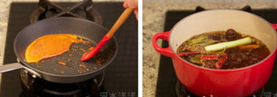 3、糖先融解成无色透明的液体,等温度超过160摄氏度后,颜色开始变黄变深,这时候必须站在一边密切观察,不断用木铲或者硅胶铲子搅拌,使其均匀受热。等到咖啡色的焦糖糖浆开始沸腾冒泡的时候,就把它从炉灶上移开。把做好的糖色倒进高汤锅里。