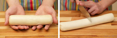 19、从窄面片的一端开始把它卷起来,卷的时候务必注意,让卷轴的一端是平的,绝对不要卷成两端都是突出来的。然后把尾巴收在平的那一端。把卷轴立在案板上,用手轻轻压成棋子形状,然后裹上保鲜膜放在一边,把剩下的另外三个剂子做完。