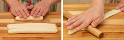 17、用手把每个剂子搓成20厘米长的长条,然后把它们裹上保鲜膜备用。