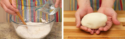 12、把面粉和水的混合物倒在面点案板上,用手捏成面团。制作过程中你或许会怀疑这个方子水是不是太少了,根本和不成面团,请相信洋洋,250克面粉+110克水+5克油绝对没有问题,是一定可以和成面团的。这样比较干的面团正是白吉馍的一个特色,正是因为面团含水量低,才能很容易烙出酥脆的外皮,如果含水量高,就会导致烹调时间延长,外皮会硬而不脆(就像西式酸面包一样)。