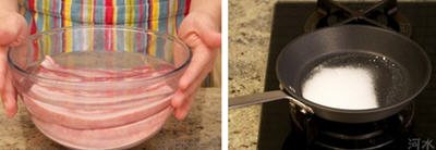 2、猪肉浸泡至45分钟的时候,把高汤放进炖锅里备用。另取一个小平底锅制作糖色,把25克糖倒入锅内后大火加热,等到部分糖开始融化后就降低到中火。