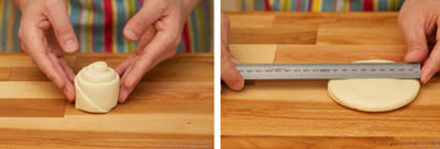 20、把四个棋子形状的馍坯用擀面杖压成直径10厘米的圆饼。