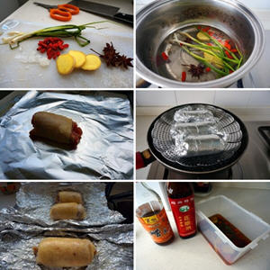 3、鸡卷蒸的原汁可一并倒入卤料中。