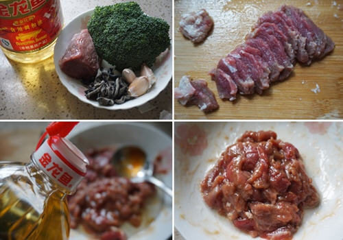 1,备料:牛里脊肉 50克,西兰花100克,黑木耳5克,金龙鱼调和油适量,盐适量,大蒜15克,淀粉5克,蚝油15克