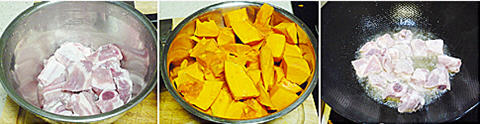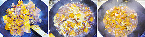 6、待小排炒至焦黄,加入南瓜翻炒;