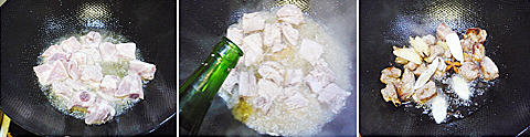 4、大火炒小排至颜色变白,加入花雕酒,继续炒;