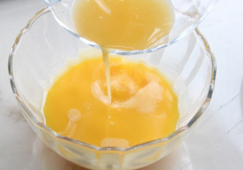 2、 挖出的肉榨成汁,鸡蛋打散,打久一点,打得细腻些,然后滤去蛋筋
