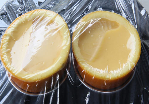6、 牛奶液倒入橙子皮中,然后用蛋挞模具固定好,盖上保鲜膜,戳几个小洞