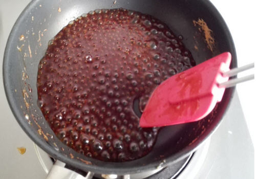 9、另起一锅,放入耗油、白糖,少许的清水,小火烧开,煮至汤汁浓稠,关火