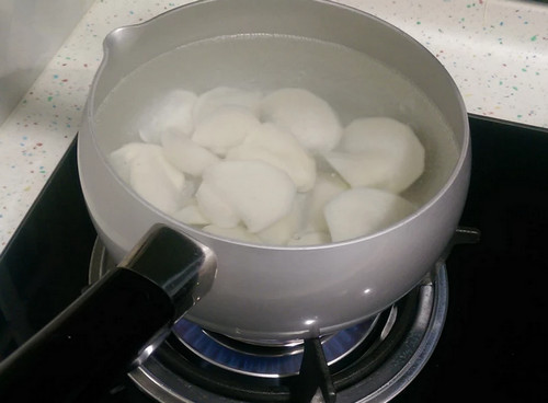 2、滚水放入白萝卜至微熟(呈一点透明状),捞起备用。