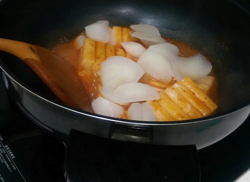 4、加入年糕后,让它稍微可以分散后,倒入年糕酱。