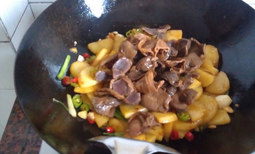 6、炒一会,让土豆片与鸡胗融入到一起后,把葱段放入,大火炒匀,可以出锅。