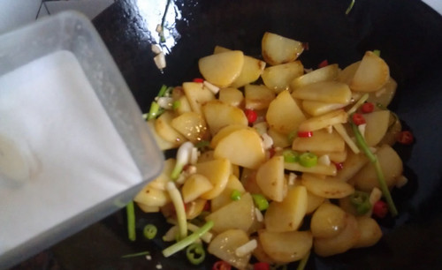 4、放入煎香的土豆片翻炒,并调入适量的盐,糖,味极鲜,蚝油炒匀。