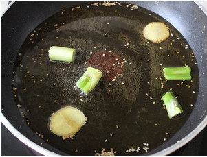 4、炒锅中倒入200ml植物油,加入葱段姜片,烧热至微起烟。