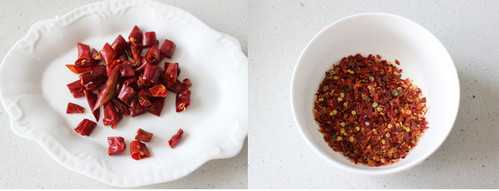 1、先来自制辣椒油,取乾t辣椒一大把,麻椒一小撮,用料理机打碎。