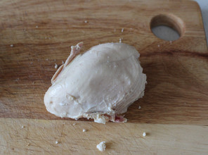 1、鸡胸肉入锅煮至刚熟时捞起,立即放入冰水中,以保证鸡肉鲜嫩的特点。