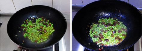 4 锅中注入油,爆香葱碎。加入泡椒。再放入腊肠丁煸炒至腊肠变色。
