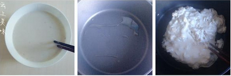 6、锅内注少量的油微微烧热后倒入薯浆(中火配合哈)用筷子不停划圈;