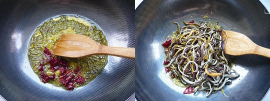 2.热锅冷油,煸香生姜,辣椒段,加入鳝丝。