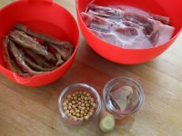 1.首先处理干笋,干笋要泡开,然后煮软。我采用了煮汤的方式,这样即有高汤,又得到味道鲜美的笋子。将干笋泡开,中间换几次水,清洗一下;同时将大排也泡出血水;还有一小块板鸭也泡上,板鸭的作用是让汤更加鲜;再备上一把干净无坏豆的黄豆(黄豆不要泡,煮出来才会更加香且不会太面);还有一块姜,这就是全部煮汤的材料。