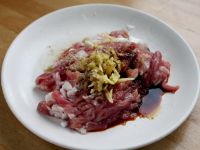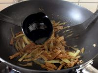 3.煮汤的同时将肉切丝,调入葱姜、盐、糖、胡椒、酱油和淀粉,抓匀,腌一会。