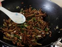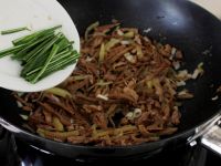 6.锅中再倒油,温热下调好味的肉丝,滑炒变色。然后将炒好的素菜倒入锅中,翻炒V。最后加入青蒜叶,翻一下即可。