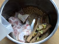 2.将泡好的笋、骨头(从大排上取下来的)和板鸭,还有黄豆和姜全部放入高压锅内胆中,加约1200毫升的水,定制高压煮20分钟。