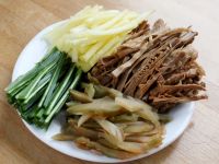 4.将煮好的笋取出切丝,同时再配些榨菜,黄椒和青蒜。