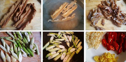 2、春笋去壳,切成斜条,在放了盐、植物油的沸水中煮一两分钟,捞出春笋,冲凉,沥干水份备用;