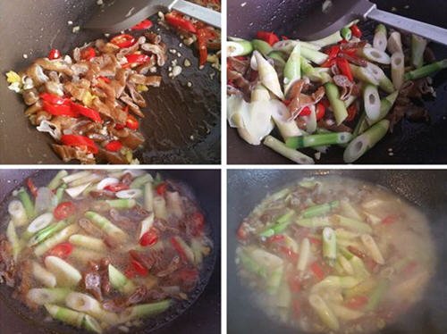 4、坐锅热油,爆香蒜末、姜末、红辣椒,下入腊猪肠,略翻炒;下入春笋,翻炒片刻,倒入温水,水量至少没过食材,小火慢煨,中途放少量盐、生抽提味,煨至汤汁快要收干,加一点白糖提鲜,即可关火,起锅装盘。