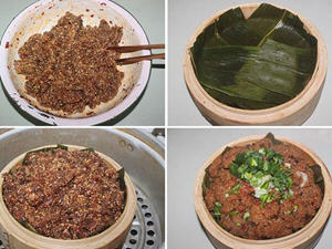 7、将拌好的牛肉放到蒸笼里,再放到蒸锅中,开锅出蒸汽后中火蒸30分钟;半个小时完全能蒸熟,而且非常的嫩滑,如果蒸好的牛肉咬不动只能说你选的牛肉不对;