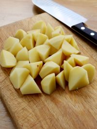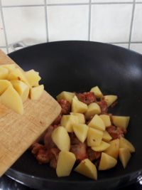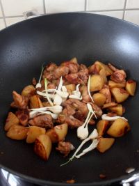 5.继续炒,如感觉有点干,可点少量的水,继续炒,就这样反复两三次,一直不盖锅的煎炒。当土豆也变得焦黄,中间无硬芯时,加入新蒜,新蒜是很好熟的翻炒两下就好。
