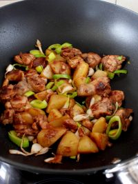 2.全程不盖锅的煎炒,感觉有点干,可点少量的水,继续炒,直到炒熟,表面焦黄。这样炒出来的鸡和土豆都特别的香。