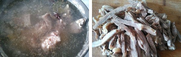 2、中火煮20几分钟至牛肉熟,中途撇去浮沫,将煮熟的牛肉切成条。