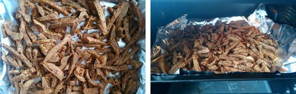 4、铺在铺好油纸的烤盘里,放入预热的烤箱中层,上下火,200度,烤10分钟,用筷子翻一翻,再烤10分钟左右。