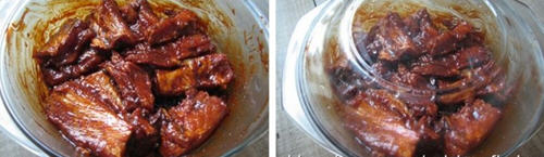 3、用刷子把每一段排骨都刷上烤肉酱。