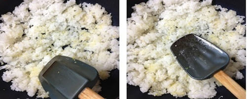 10 : 均匀的边切 ,边压平之后 , 再翻搅拌至白饭 , 蒜 ,橄榄油(或食用油)均匀的入味 。